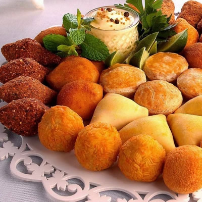 Coquetel de salgados variados, servidos à vontade nas mesas